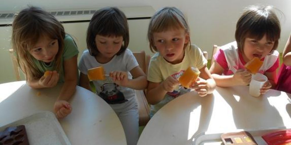 Skupaj smo izdelali presne kokosove kroglice, ki se v poletnih dneh še posebej priležejo, saj ne vsebujejo sladkorja in so jih naši želodčki bolj veseli. Izdelali smo sladoled, recept je sila preprost in vam ga izdamo: sadni sok smo vlili v razne modelčke, zamrznili… in pojedli. Naša specialiteta so korneti s podobo indijanskih šotorov. Slike povedo več kot besede…